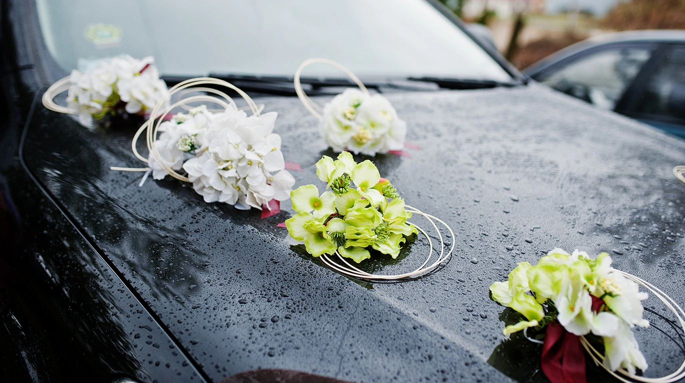 Vehicles can be decorated according to your preferences, including floral arrangements and ribbons. We coordinate with your florist or provide our own arrangements. Decoration details are confirmed during the planning process.